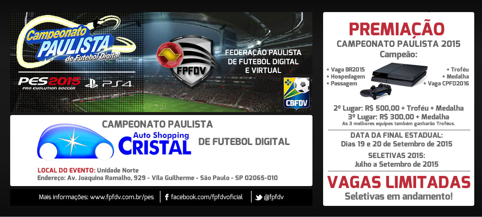 – 03 Vagas para a Final Estadual do Campeonato Paulista de Futebol Digital 2015. A Final Estadual do CPFD2015 será disputada nos dias 19 e 20 de Setembro de 2015, na cidade de São Paulo/SP.