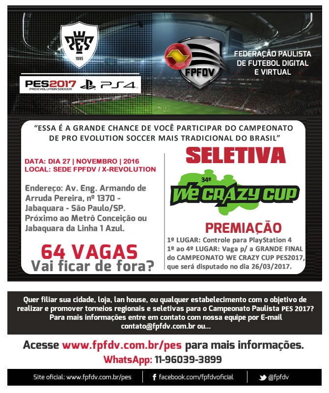 Faça agora mesmo a sua inscrição para a 1ª SELETIVA do WE CRAZY CUP – CAMPEONATO DE FUTEBOL DIGITAL – PES 2017.
